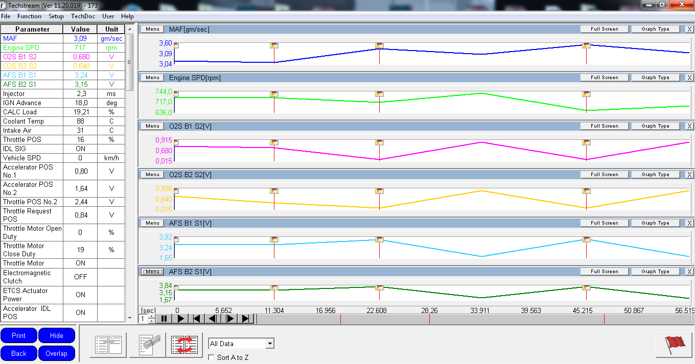 Lexus RX330 2003 год, приезжал около недели назад с той же DTC.Сегодня опять привез туже ошибку, в добавок еще и по иммобилайзеру. Устанавливали ему сигнализацию в другом месте. После того как я удалил ошибку, через пару часов позвонил клиент,опять загорелcя Check. Установил версию 11.20.019 с официального сайта. Сделал тесты на A/F control и др, перепроверил что все открывается и сохранено. Позже пришел домой, открыл файл с тестами и Data List, файл стал Error. После диагностики сел АКБ, не завелся, отключил клеммы от АКБ. И решил проверить свой новый тестер для АКБ BA101, который высветил на дисплее Reaplasement (замена). Клиент заказал мне акб 75 TAB обратной полярности, который уже в пути и сегодня будет. После снятия клемм я обратил внимание, что кнопочки стекло подъемников, кроме водительского не активны. Какие тесты кроме A/F Control, и какие мои последовательные действия с этой DTC ?