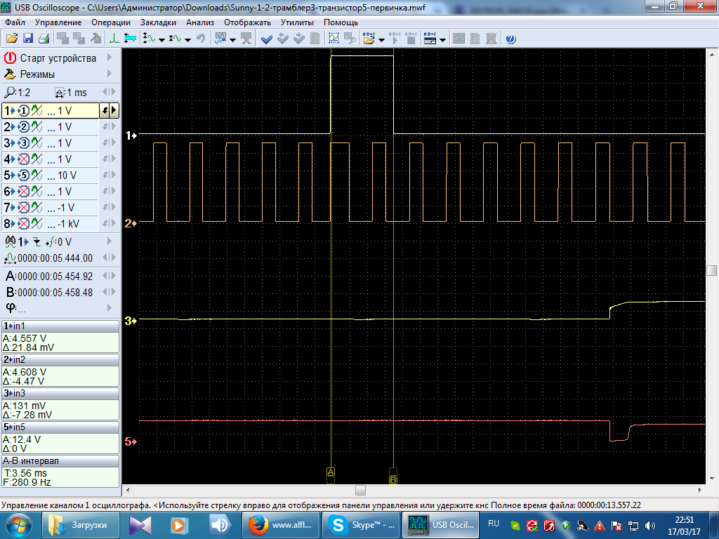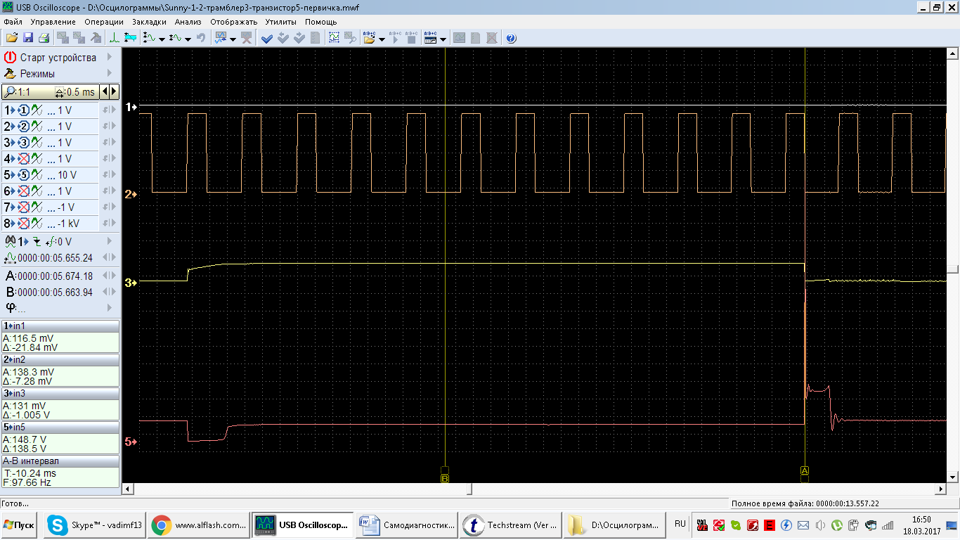 Вся процедура с трамблером проведена была для полной уверенности, что там все в порядке. Сигналы не изменились, может другие свечи. С ними машина работает стабильнее. 3 канал сигнал с ЭБУ на базу транзистора, подключал к разъему, 5 первичка, подключал к катушке.