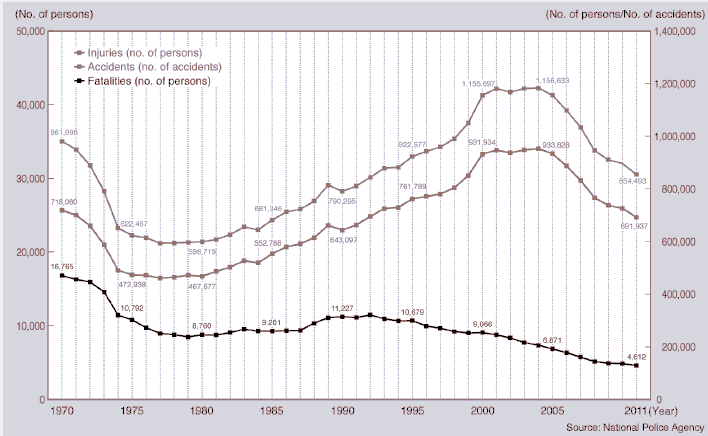 Статистика последствий ДТП в Японии (по годам)