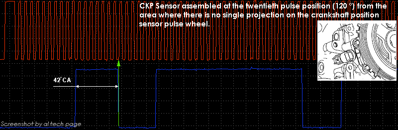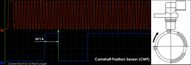 Вариабельность положения сигнала датчика распредвала (CMP) относительно коленвала (CKP) заметна на этих скринах и, в данном случае, она равна примерно 18° CA: