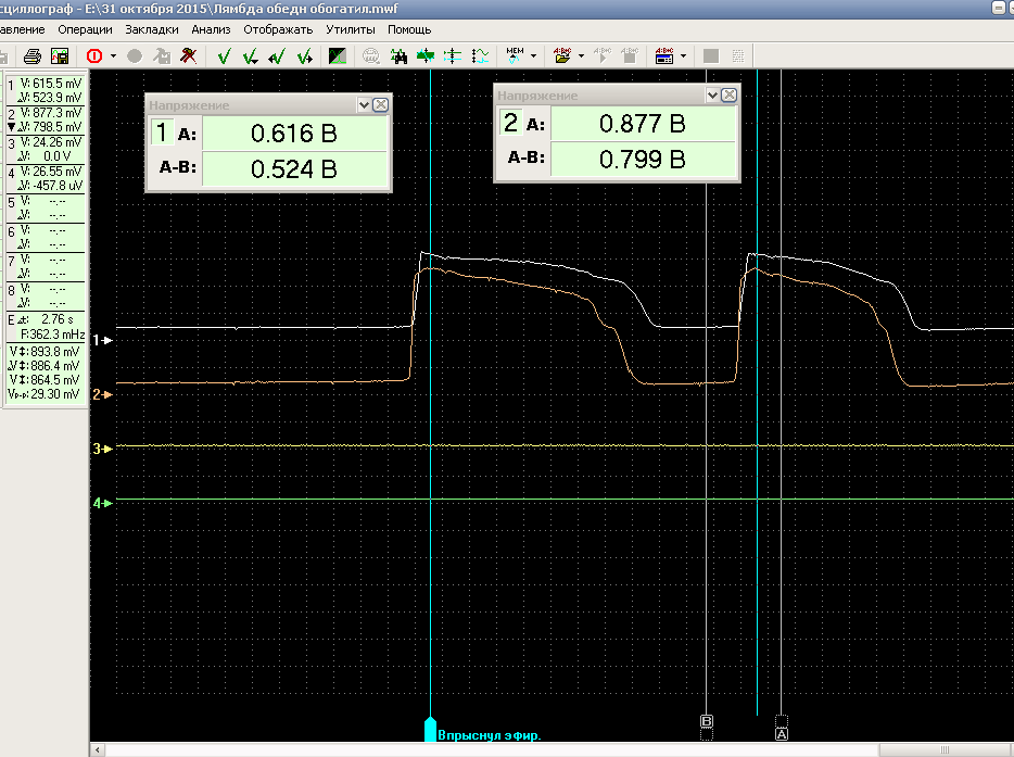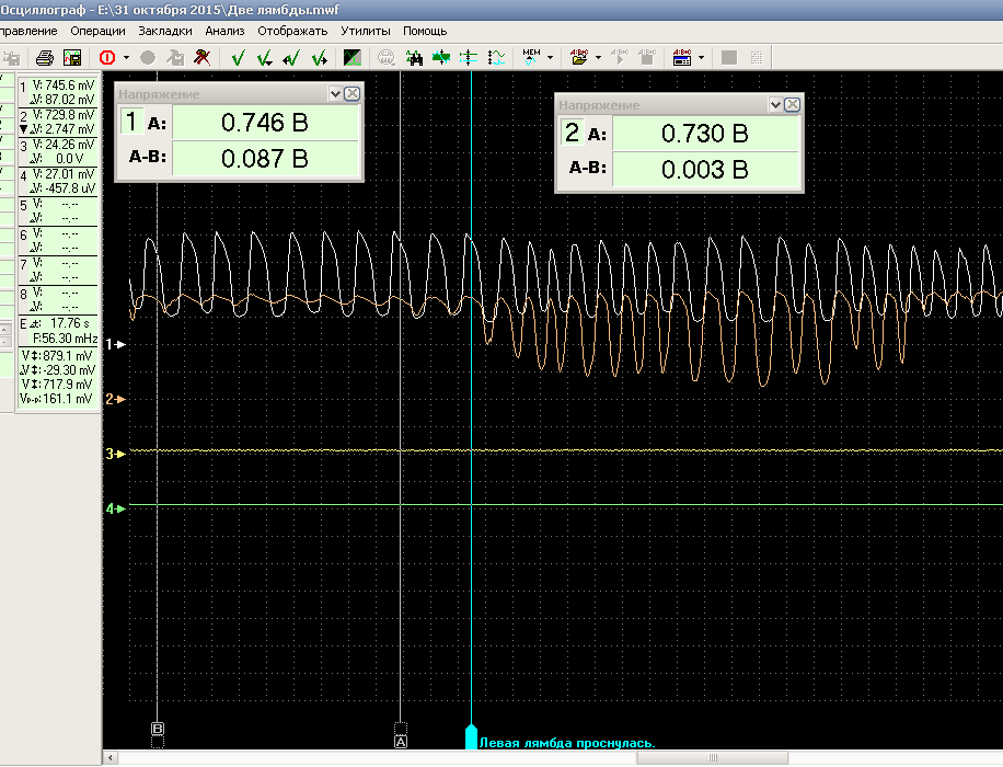 Осциллограмма двух лямбд, (уточню, что в этом авто мотор V6, а лямбд 2 шт, только перед катализатором), показала, что лямбда левой головы, то "зависает" в высоком уровне, то вдруг "просыпается и начинает работать.