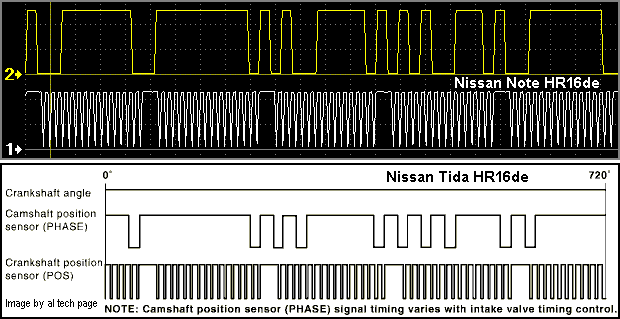 HR16de CKP and CMP waveforms of Nissan Note vs. Nissan Tida