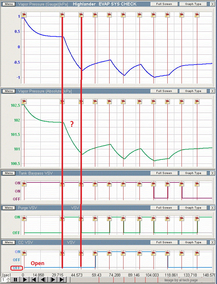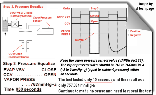 На участке 2: клапан Tank Bypass ON (Open), Purge VSV ON (Open) and CCV OFF (Open) идет разряжение (давление в баке падает). Каким образом это происходит, ведь клапан CCV OFF (Open)? А если учесть тот факт что резиновый шланг на него не был одет вовсе, то "статус Open" будет всегда по умолчанию на протяжении теста