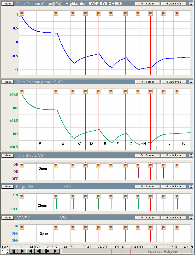 Участок K - поступает свежая порция вакуума через открытие Purge VSV. При этом мы не видим падение давления, что указывает на исправность клапана bypass VSV, потому как он отделяет вакуум впускного коллектора от датчика Vapor Pressure Sensor.