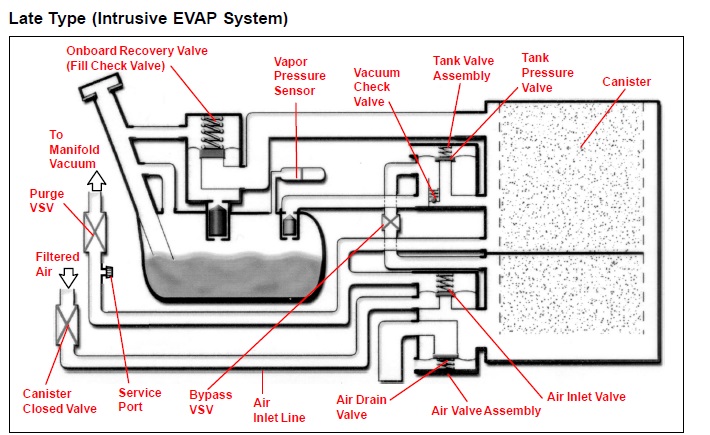 The Late Type EVAP System, also known as the Intrusive type, was developed to meet the very stringent, mandated standard of detecting a hole 0.020 inch (0.5 mm). This system uses many of the same components as the early type EVAP system. Purge, vacuum relief, pressure relief, and ORVR operations are identical to the early type. Refer