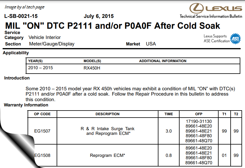 и рекомендуется Reprogram ECM and R&R Air Fuel Sensor