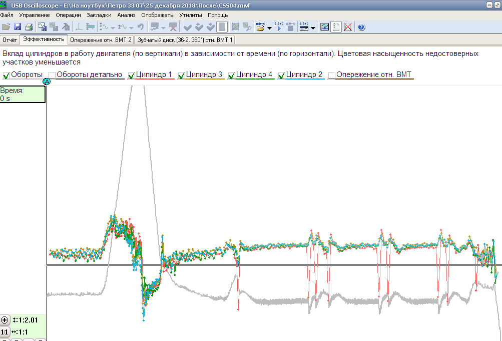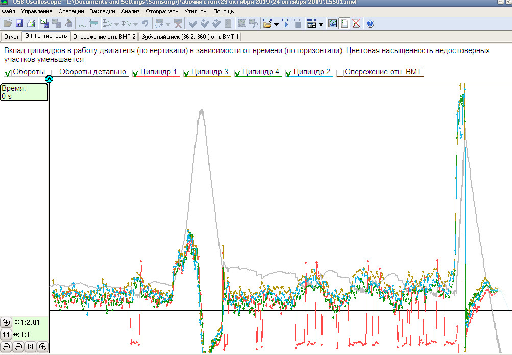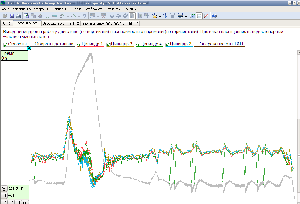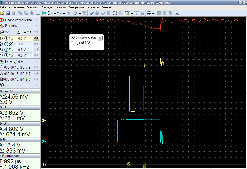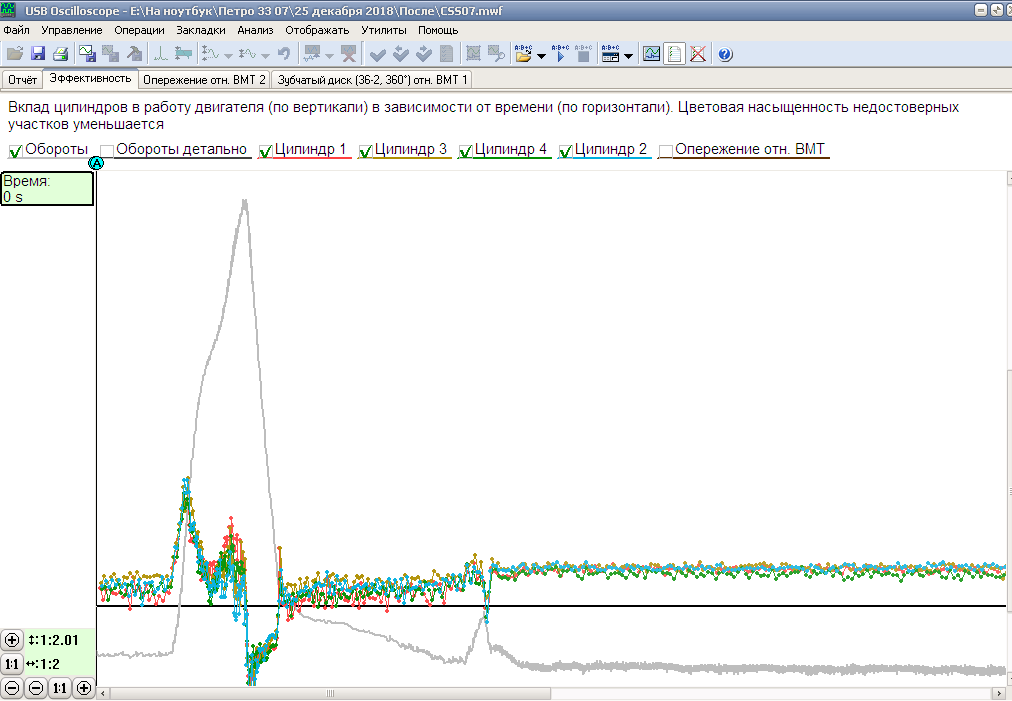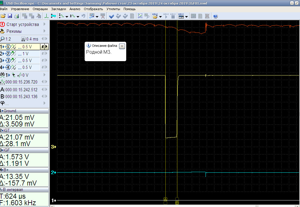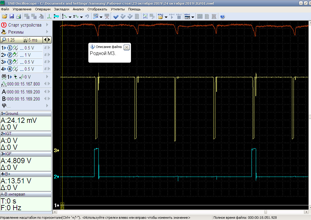 Просмотрел всю запись осциллограммы, но никаких неисправностей по IGF первого цилиндра так и не увидел. Или нужно ожидать "умирания" катушки теперь уже 4-го цилиндра? (Забегая наперед скажу, что после замены катушки первого цилиндра на новую дефект пропал.