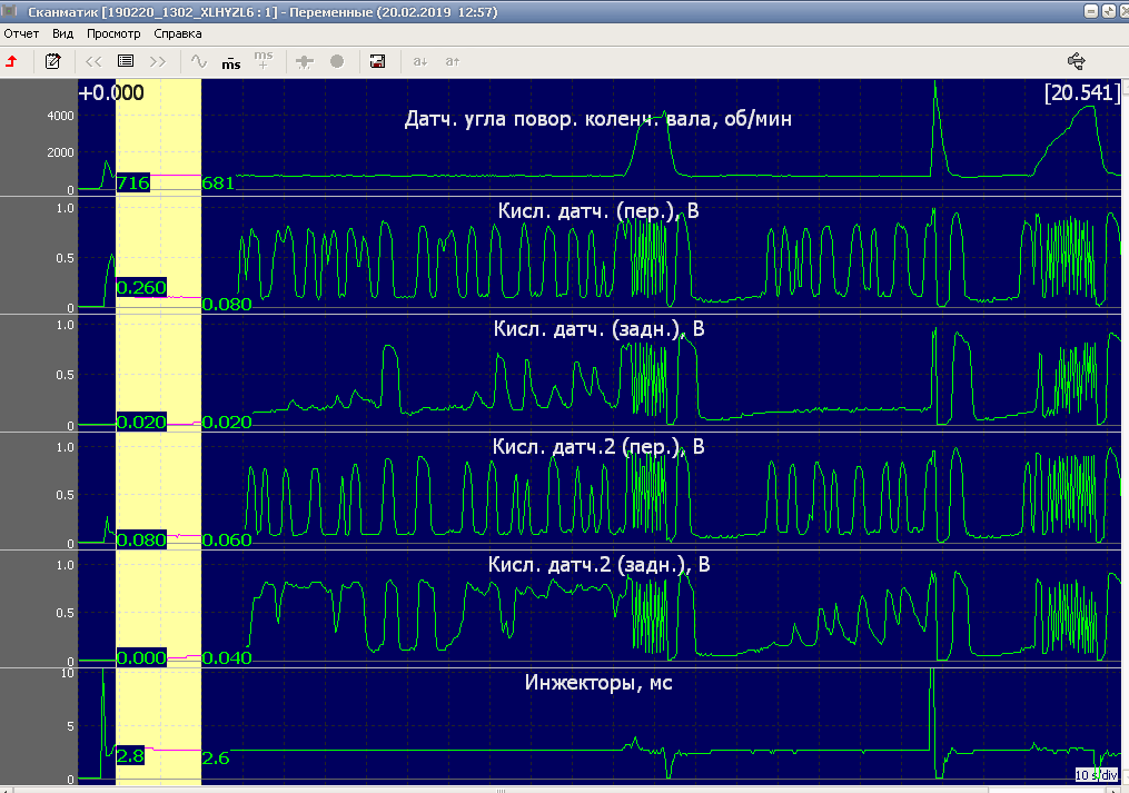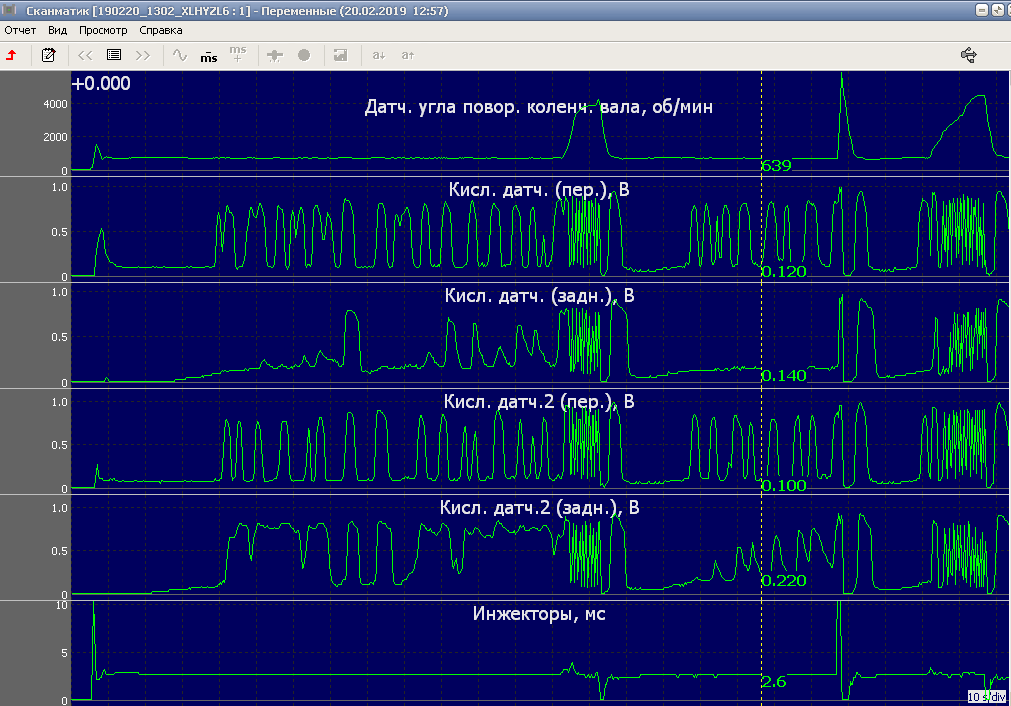 Потом посмотрел работу всех четырех лямбд на ХХ + две прогазовки. И, ещё - только ХХ с принудительным обогащением эфиром и принудительным обеднением при помощи подсоса воздуха: