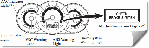 Наличие в этом авто Brake Control System c ABS with EBD, Brake Assist, TRC, VSC, Hill-start Assist Control and DAC Вы можете подтвердить индикаторами приборного щитка: