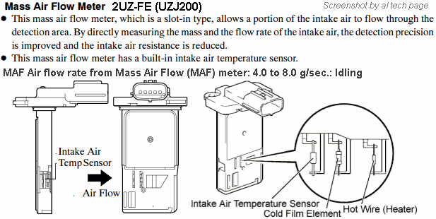 Плиз, обнародуйте первоисточник, в котором указано, что "2uz MAF - 2.0 to 3.9 g/sec" и какого г.в. тот 2UZ-FE и сообщите Model code того LC или LX.