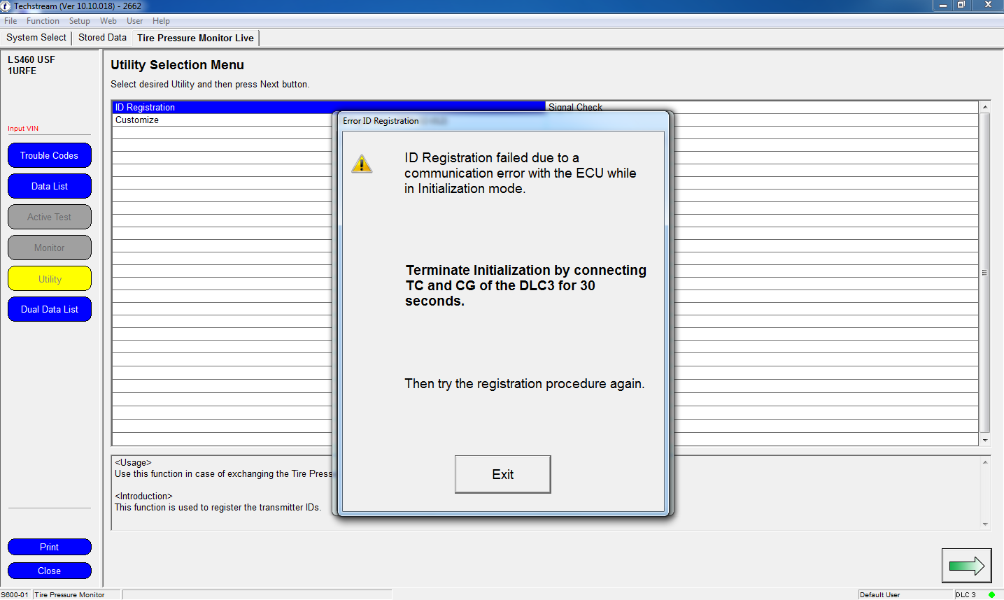 If “Lost Communication With ECU” appears during the registration process, then terminals TC and CG were not connected properly or the key was cycled during this process.