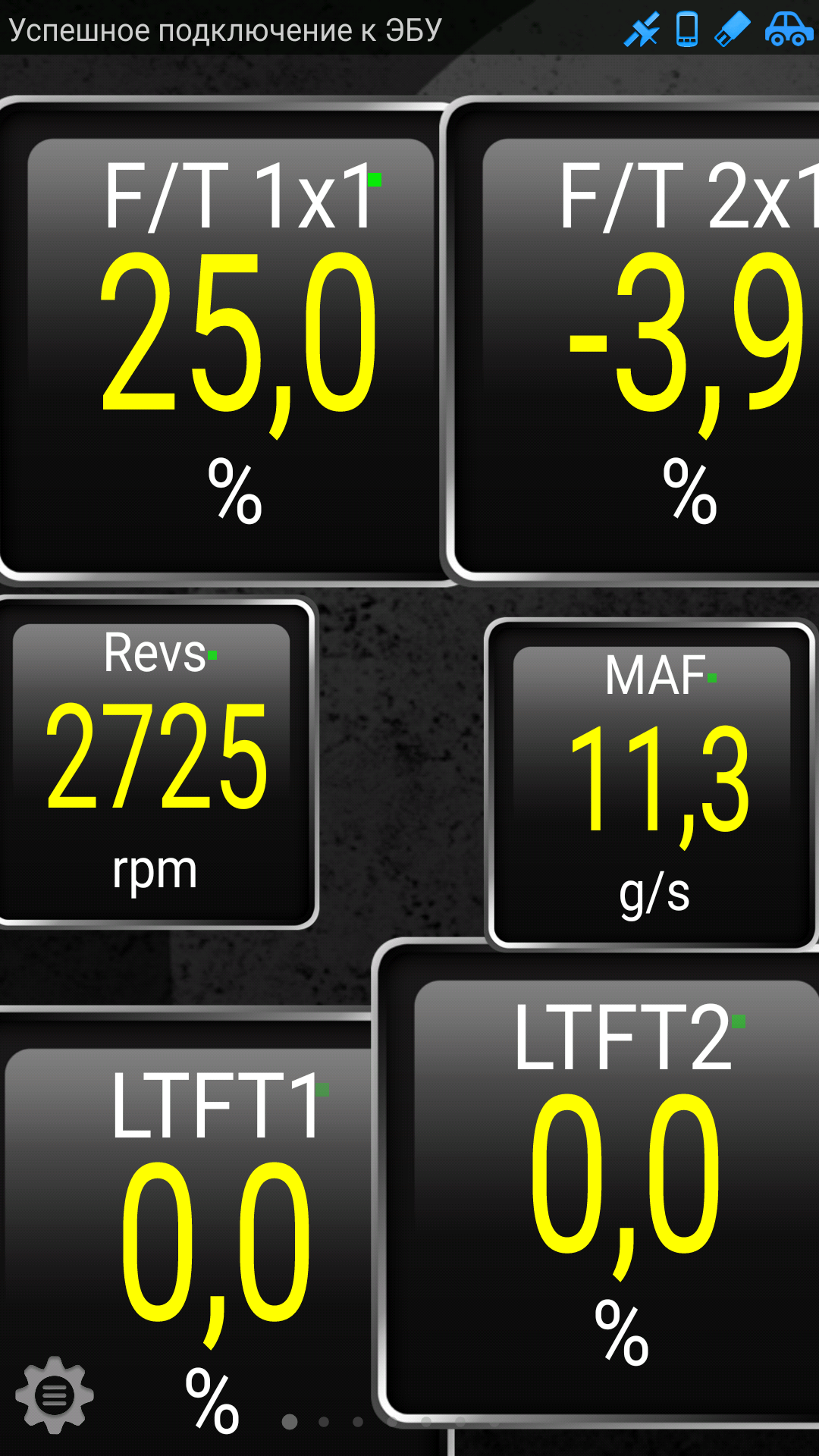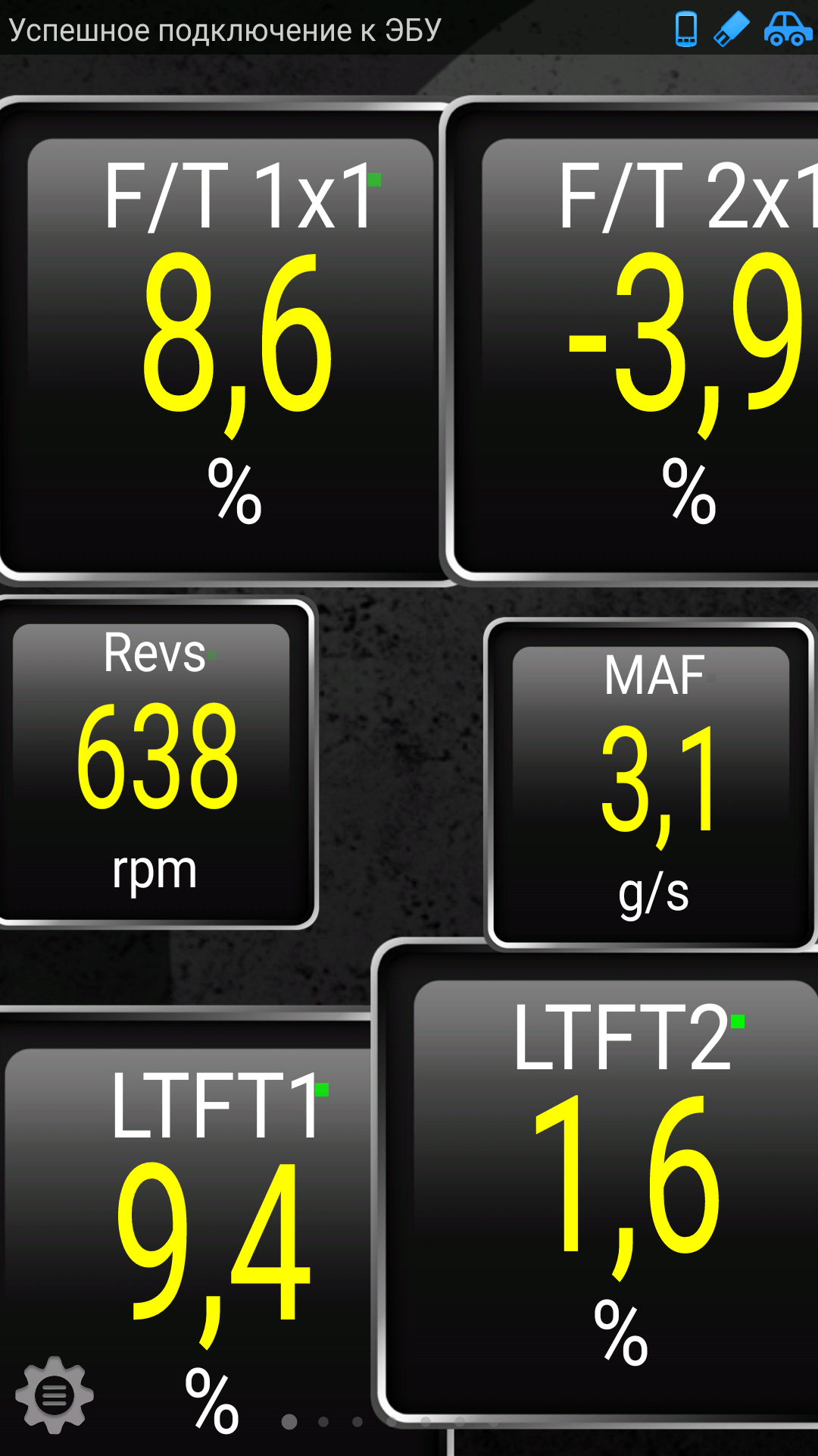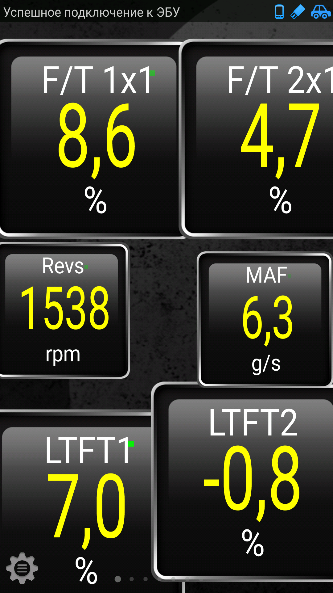 Для полноценного анализa параметров БУ, установите Torque Log Analyzer (https://chrome.google.com/webstore/deta ... authuser=0, http://torqueloganalyzer.blogspot.it/20 ... oogle.html, http://torqueloganalyzer.blogspot.it/20 ... er-as.html, http://pleasedonttouchthescreen.blogspo ... orial.html) и покажите лог(и) при таких режимах прогретого двигателя: