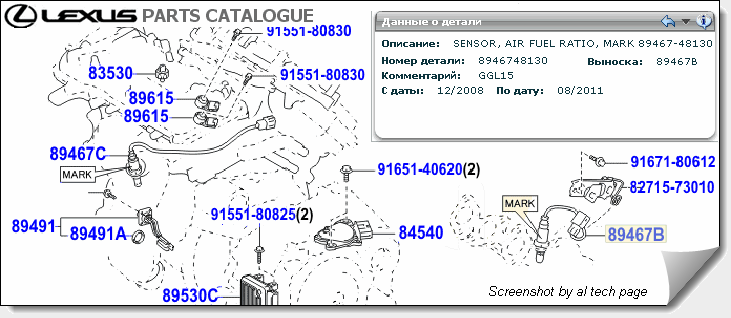 3. Пока (до выполнения п.1) и с большой долей уверенности, главный подозреваемый A/F Ratio Sensor B2S1 (OEM Part.No. 89467-...) проверьте "на месте" номера всех других "кислородников"), а не O2S B2S2.