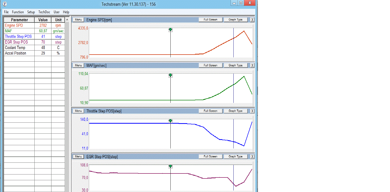 Тест "EGR STEP POS" проводил, но, к сожалению, не сохранил в лог. Скажу только, что при закрытии клапана EGR до нуля, показания MAF меняются на 2g/s.