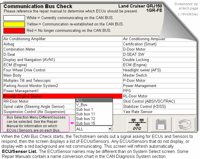 Примечание. Следует помнить, что в единичных моделях некоторых г.в. возможно некорректное выполнение отдельных проверок (в этом режиме). Поэтому для перепроверки стоит считывать коды неисправности и прочие данные и в меню конкретных систем. E.g. techinfo.toyota.com/techInfoPortal/staticcontent/en/techinfo/html/prelogin/tsrss/ts_known_bugs.html#open112