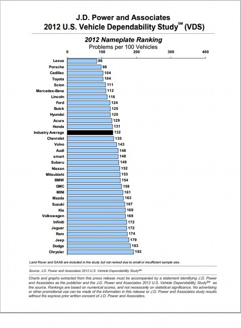 Данные J.D.Power о надежности 3-летних авто в 2013 и в 2012 годах: