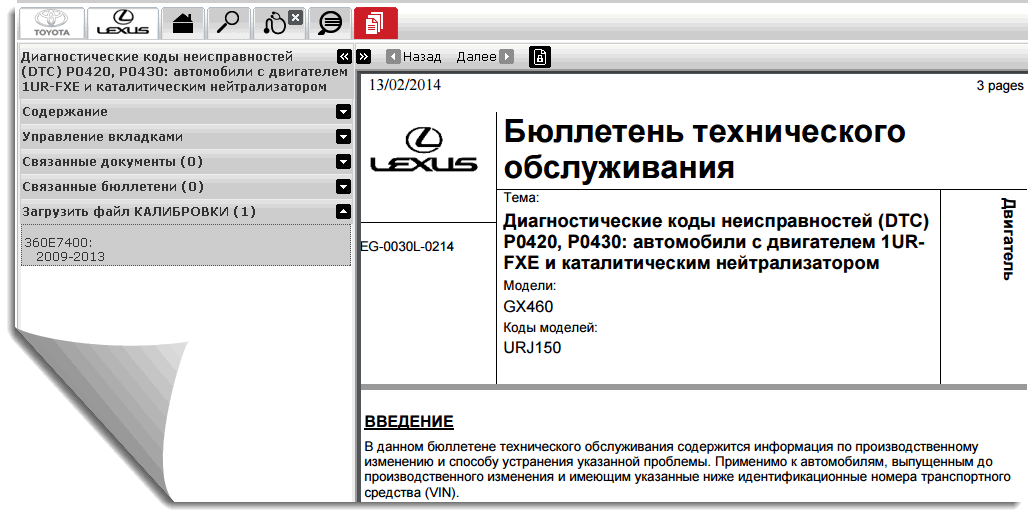 И действительно, есть TSB "Диагностические коды неисправностей (DTC) P0420, P0430: автомобили с двигателем 1UR-FXE и каталитическим нейтрализатором" для модели GX460 (URJ150) о Cal ID 360E7400.