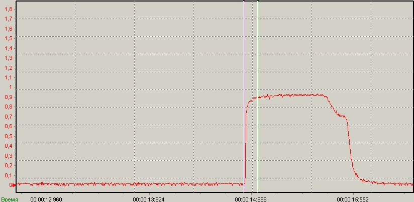 Вот снял показания с нового датчика, но нагрев производился газовой горелкой, как видно из графика, определить правильное время отклика не получается, здесь оно - 578 мс, что не соответствует действительности: