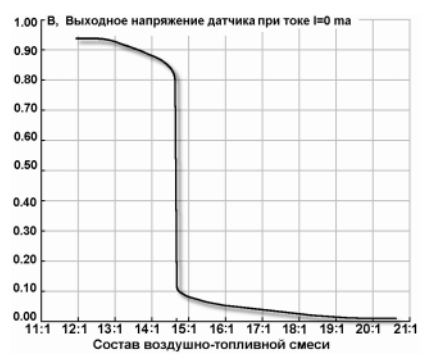 В этом режиме (при отключении смещения за счет разъединения сигнальных проводов датчика) широкополосный датчик практически ничем не отличается от обычного кислородного датчика и генерирует напряжение, величина которого зависит от состава смеси.